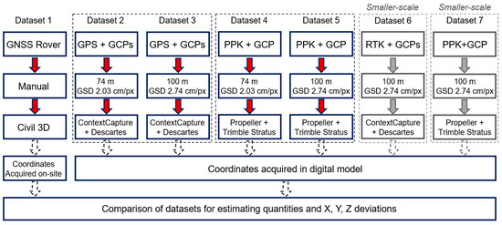 The research methodology consists of seven datasets, which include a conventional ground-level survey with a GNSS receiver and three UAV-based photogrammetric approaches, including data acquisition with a GSD value of 2.03 and 2.74 cm/px. During data acquisition, stockpiles were not changed, and the quarry was inactive. GNSS receiver data was processed using Civil3D engineering software. Datasets, including GCPs-based and RTK data, were processed using desktop Bentley ContextCapture software and analyzed using Bentley Descartes. Post-Processing Kinematic datasets were processed and analyzed using cloud-based Trimble Stratus and Propeller platform. The research methodology scheme is shown in Figure 3.