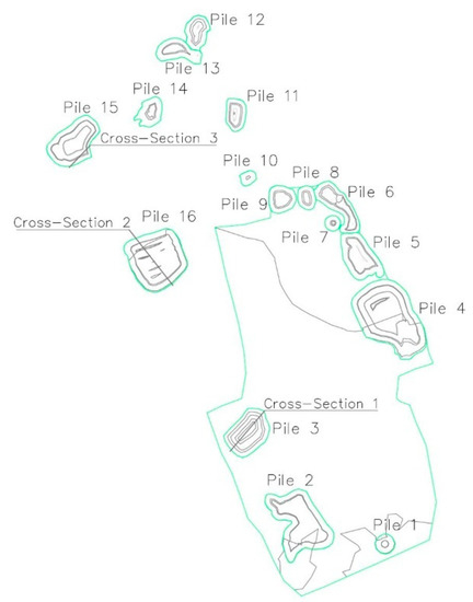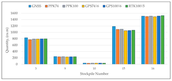 The quantities of stockpiles are reported in Table 5. The highest amounts were obtained using a ground-level survey with a GNSS receiver. It is almost impossible to calculate the exact amount of the earth, but the inaccuracies are visible in the random cross-sections demonstrated in Section 2.2. The results of 16 stockpiles are provided in Figure 14.