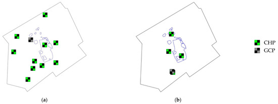 Post-Processing Kinematic (PPK) survey control points configurations in a test site: (a) 1 known point + 10 check points (CHPs), (b) 1 known point + 4 CHPs.