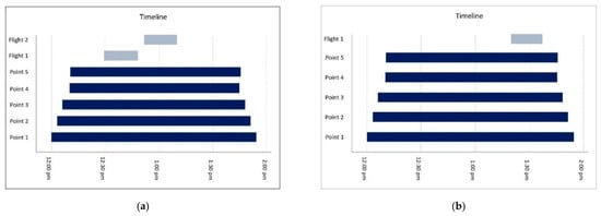 Timelines of flights and GPS data acquisition with AeroPoints: (a) 74 m flights and (b) 100 m flight.