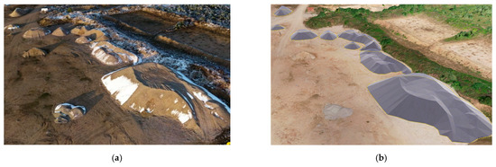 The accuracy of control points was evaluated by performing manual measurements from the surface of reality mesh (Tables S1–S6 in the Supplementary Materials illustrate the coordinates of the control points obtained from the reality mesh). The example is provided in Figure 13, where the centers of the images show X and Y coordinates acquired on site with GNSS receiver. The software processing reports in many cases provide different results from what can be measured manually using cursor in desktop application. From the practical point of view the accuracy of points was assessed by using cursor. Considering the resolution of images, X and Y values may have not been estimated with high precision, therefore the main focus of accuracy assessment was intended on volume and Z values analysis. To measure Z values, the same manual method by using cursor as mentioned before was used. Not depending on the images’ resolution, for height measurements this type of evaluation was reliable.