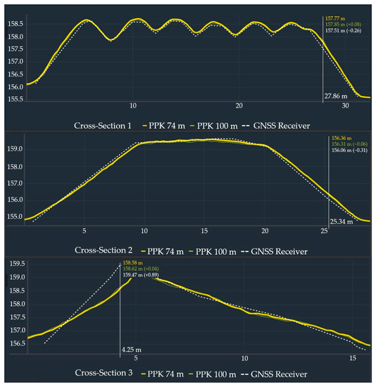 In selected cross-sections it is visible that the differences between two reality meshes obtained from 74 and 100 m were about 0.04–0.08 m in some parts. Compared to the survey design imported from Civil 3D, the differences in some parts of the cross-sections were as high as 0.26–0.89 m. This is because manual measurements were taken every meter or several meters.
