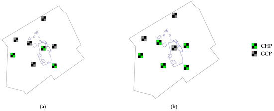 Real Time Kinematic (RTK) survey control points configurations in the testing site: (a) 5 GCP + 3 CHPs, (b) 3 GCPs + 5 CHPs.