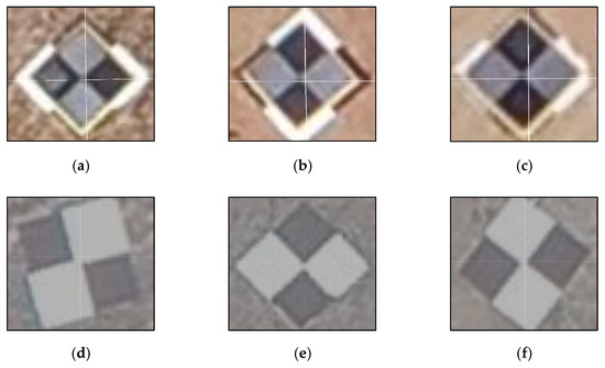 Example of X and Y measurements in the reality mesh model. The centers across the images show GNSS receiver coordinates acquired on site—in the Trimble Stratus platform: (a) point no. 4, (b) point no. 5, (c) point no. 6; in Bentley Descartes application with mesh transparency set to 50%: (d) point no. 2, (e) point no. 4, (f) point no. 9.