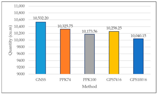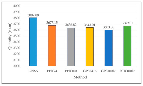 A total of 16 individual stockpiles containing more than 10,000 cubic meters of earth were assessed for quantity, efficiency, and accuracy. Firstly, the ground-level survey was conducted with Trimble GNSS receiver and processed in Civil 3D software. Then the data was captured using three different UAV-based photogrammetric approaches. GCPs-based and RTK data from UAVs was processed using ContextCapture and analyzed in Descartes. PPK data was processed using Trimble Stratus powered by Propeller platform. The results from Civil 3D were imported into photogrammetric reality mesh models for comparisons. Exactly the same measurements’ boundaries were used in all cases (Figures S1–S3 in the Supplementary Materials show the examples of the boundaries used for stockpiles volume comparison). Ground-level survey data consisted of 1108 points and of 5549.55 square meters of surface, and it took about one day to measure. Meanwhile, it took 37 min to fly at 74 m and 17 min when flew at 100 m to get data with millions of points, and they covered an entire area of 36 ha. Processing time was approximately from 4 to 10 h, regardless of which method was used. Bentley applications required more time and specific knowledge, but the visual output is much better with more scope for further analysis. GCPs workflow demands about 10 times more work on the site each time, placing the GCPs in the right positions and surveying them compared to RTK or PPK methods.
