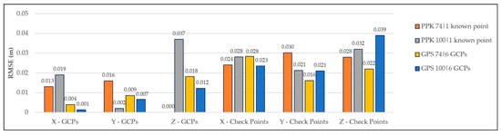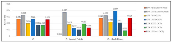 The accuracy of the analyzed methods was evaluated by assessing the differences between the ground-surveyed markers and control points measured in photogrammetric models. Modern software, most adapted by the survey method was used, and the specificity of each software was not analyzed in detail. The deviation results were expressed in root mean square error (RMSE) values. As in real-life situations it is often not possible to place control points by using the correct scheme due to obstacles or moving traffic, some markers were placed on the edges of the surveyed area. The reason behind this placement was to analyze how each technique can cope with such irregularities of control point placement. PPK approach using Propeller AeroPoint markers as GPS recording base stations, was capable to use a one known point method. Primary results presented in Table 7 show that GCPs-based surveys with five and eight GCPs configurations were obtained with abnormal values and were therefore rejected from further investigation. Abnormal Z values may have occurred for several reasons. One of them may be that five GCPs were not sufficient for an area of 36 ha when using GCPs-based approach. Depending on image resolution, the recommended ground control points to be spaced about 20,000 pixels from each other, which means that in our cases the distance between GCPs should be about 400 m when flying at 74 m, and about 550 m when flying at 100 m. However, the distances were less or about 400 m. The reason for abnormal values could be insufficient number of GCPs. Inaccuracies in eight GCPs configuration could have occur because of a measurement mistake when determining the markers. If one of the measurements was not very precise, then more ground control points may give a negative result because the whole model can be deviated or turned. Additionally, in most cases, a checkpoint number 8 was obtained with an abnormal value. This happened because a checkpoint was at the edge of the mapping area and the accuracy was lost. This checkpoint was eliminated, and the results are shown in Table 8. Further, GCPs and CHPs were separated for inaccuracy analysis; five and eight GCPs configurations were dismissed from further analysis (Table 9). A table illustrating the GCPs and CHPs RMSE values for eleven points is provided in the Supplementary Materials (Table S7).