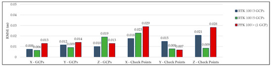 A 100-m-height PPK survey was additionally performed with five control points under winter conditions for the observation of the influence of weathering. In this case only one ground control point was used for processing. Additional visual results of the smaller-scale RTK and PPK study are presented in Figure 18. GCPs and CHPs separated RMSE values presented in Table 12 and Figure 19.