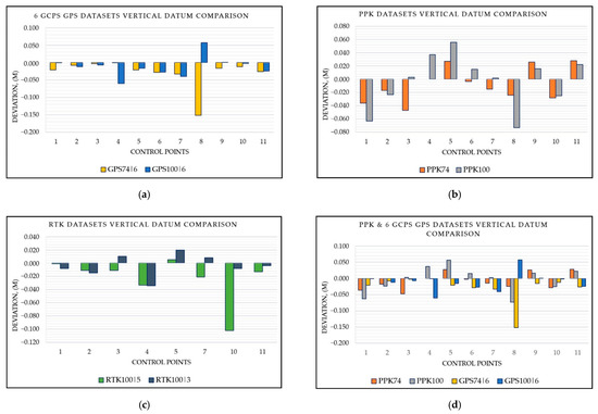 Vertical control points analysis: (a) 6 GCPs-based GPS datasets, (b) 1 known point PPK datasets, (c) 3 and 6 GCPs-based RTK dataset, and (d) vertical datum comparison of PPK and 6 GCPs-based GPS datasets.
