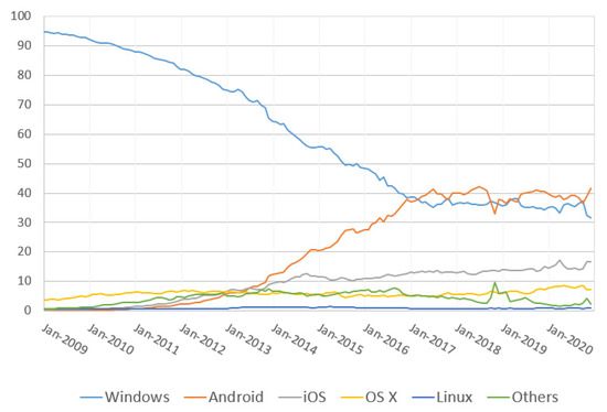 - StatCounter Global Stats. Available online: https://gs.statcounter.com/os-market-share (accessed on 15 January 2021).