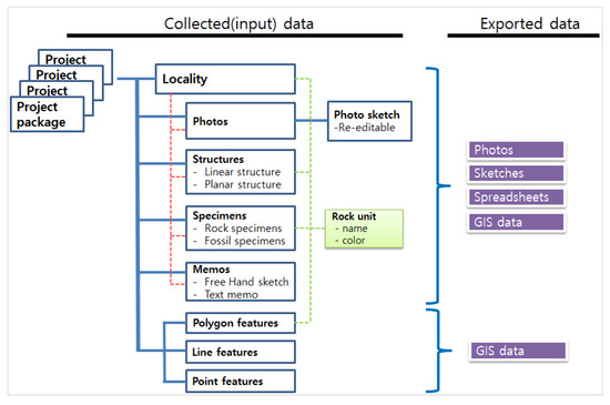 Data collected during geological surveys are structured by defining relationships (Figure 2) and packaged on a project basis. The information in the package consists of locality data, photographs, sketched content on the photographs, structural measurements, samples, and memo data. Rock units associated with each locality must be cross-referenced with structures and specimens. The survey data must be structured in conjunction with the locality but have a weak relationship with it. That is, individual survey data should have a reference relationship with locality information as independent survey data rather than a subordinate relationship with a particular locality. Geological features represented by polygons among the geometry elements on the drawing may be linked to rock units. In the correspondence between digital and traditional recording media, geometry elements on the map correspond to field slips, and detailed records correspond to the field notebook. The descriptive content collected in the digital geological survey system is collected in a spreadsheet, and the geometry elements depicted on the map are converted into a GIS layer.