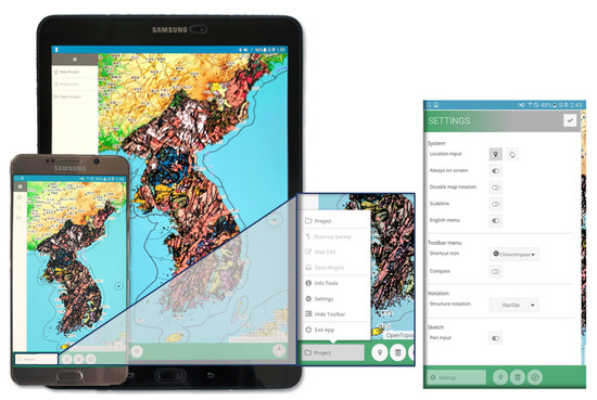 KMapper is available on the Android OS and is designed to be used with various screen sizes such as those of tablets and smartphones. If a pen is available, sketches and notes can be added efficiently, and the location input method can be selected as GPS or screen touch input depending on the environment of use. Various record data, such as photographs, geological structures, specimens, and memos, based on the location can be collected during a geological survey. The map editing function can illustrate geological features using points, lines, and polygons. Specific locations can be described with labels. Geological boundaries can be expressed with various symbols and colors and can be edited easily from the touch-based interface using the “line cut” and “line connect” tools. In addition, if the boundary of an outcrop area is in the form of a region, a line can be easily converted to an area, and an outcrop area can be easily edited to a line. Furthermore, offline maps can be added, and inputs can be exported to allow work in a desktop environment.