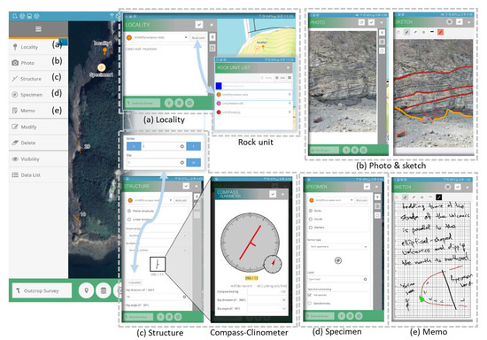 Outcrop survey tool and functions: (a) locality input panel and associated rock units, (b) photograph acquisition and sketching, (c) structure input panel and associated measurement tool (dip/dip ↔ quadrant switching of structural notation), (d) specimen input panel, and (e) handwritten memo and sketch panel.