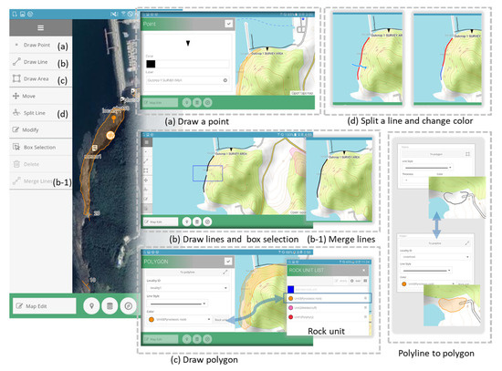 Map editing tools and functions: (a) point creation for label entry, (b) line drawing and box selection with line merge (two to one), (c) polygon drawing panel and associated rock units, and (d) line splitting and color control.