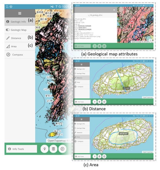 However, the development of field geological survey systems on smart mobile devices is a challenging task because they are implemented in an environment more restrictive than a desktop [20,21,22]. Smart devices using touch-based interfaces cannot use the traditional methods for operating desktop PCs, such as precise mouse operation and right-click event calls, and must also provide menus and operating environments with limited screen sizes [23,24,25]. In addition, system implementation on smart devices has the challenges of needing to combine with DB management technology to store and retrieve collected data, geographic information system (GIS) technology to represent or describe geological features, smart metering sensor control technology, and image processing technology [26].
