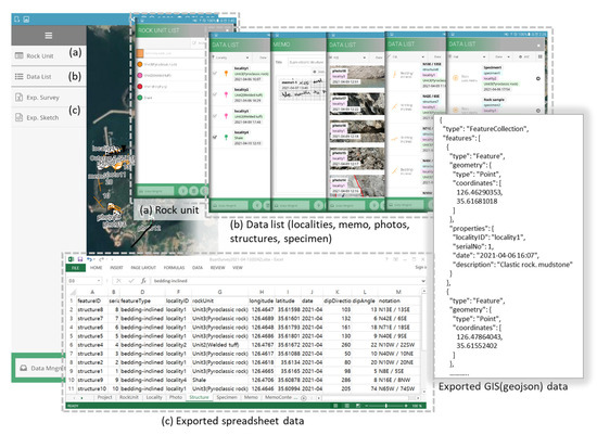 The data recorded through the outcrop survey menu are represented by a list of each type of data. Each list includes the locality, photographs, structures, samples, and notes. List items are identified by their location in conjunction with the base map, and detailed content can be viewed or modified. Items in the list can be rearranged by locality, input date, and rock unit. Records entered using the outcrop survey tool are converted to Excel and GeoJSON formats depending on the data type, and records recorded by the map editing tool are exported to a GeoJSON file. The exported files can be used for completion of a geological map in a desktop environment or backed up for long-term storage (Figure 7).