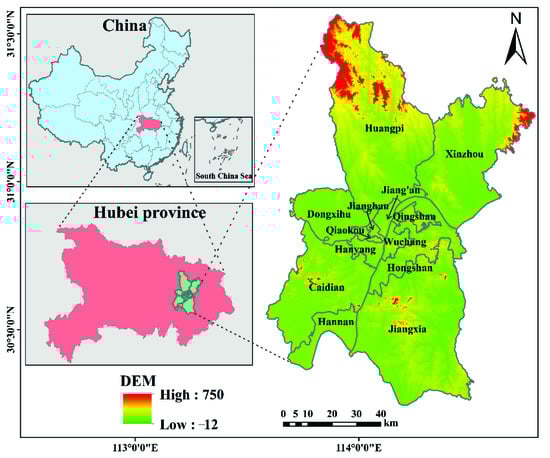 Location of the study area, municipal districts of Wuhan, Hubei in China.