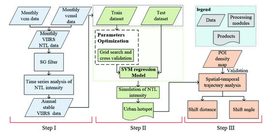 The methods used in this study included the following three steps: data processing of monthly VIIRS images, SVM regression modeling for urban area hotspot identification, and spatiotemporal trajectory analysis of urban area hotspots (Figure 3).