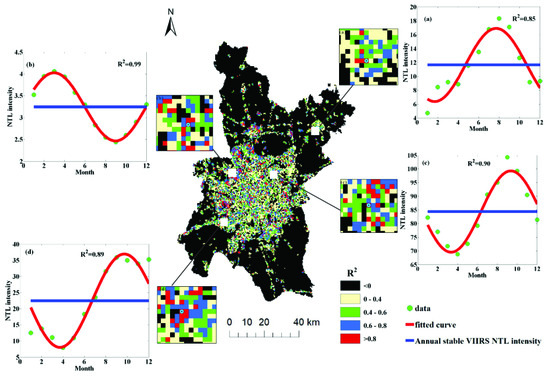 Considering the possible existing phenomenon of pixel-level NTL intensity seasonal variation, we performed the curve fitting of seasonal variations test for 2013. As illustrated in Figure 4, the test achieved a good performance at the pixel scale, with a high goodness of fit (). The values for the intra-city pixels (Figure 4a–d) in Wuhan in 2013 were above 0.85, indicating a more apparent NTL intensity seasonality in urban areas. Obviously, the time-series analysis model can capture the general trend of monthly VIIRS NTL intensity and remove the influence of seasonal variation effectively from the observed NTL radiance intensity. Using the time-series analysis method, we obtained reliable annual stable NTL data during 2013–2018. The NTL intensity of annual stable NTL data were split into training sets and test sets for further identifying urban area hotspots using the machine learning method of SVM [43,44].