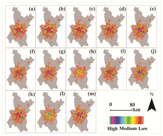 Table 2 shows the shift distance (L) and angle (α) of the urban area hotspots’ gravity center during the study period. The gravity center of urban area hotspots shifted to the southwest (SW) direction by 3.85 km from 2013 to 2015. Furthermore, the gravity center of urban area hotspots kept moving toward the SW direction by 2.76 km during 2015–2018.