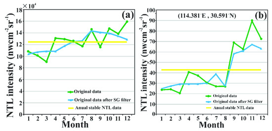 Figure 5 shows monthly VIIRS images (Figure 5a–l) and annual stable images (Figure 5m) for Wuhan in 2013. The observed monthly VIIRS NTL intensity exhibits apparent seasonality at the city scale (Figure 6a) and pixel scale (Figure 6b), which is mainly influenced by the seasonally changed albedo. In the winter, snowfall significantly increased and vegetation decreased, leading to an increase of NTL brightness. In the summer, increased vegetation resulted in a decrease in NTL illumination.