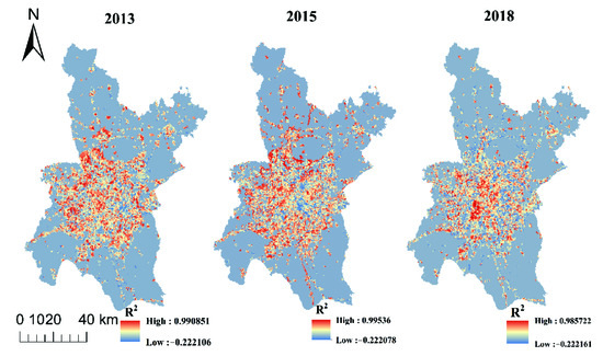 Referring to Zhan et al. [43] and Yang et al., [44], the SVR model with RBF kernel function can effectively build the non-liner relationship between geographic coordinate vector (longitude and latitude) and surface urban heat island intensity. Therefore, the longitude and latitude served as the inputs of SVR to build the NTL intensity prediction model in this study. The initial C and γ ranged from to , and the step interval was 1. To perform a five-fold CV method, the input dataset was divided into five subsets for SVM regression. Consequently, based on annual stable VIIRS data using the SVM regression algorithm, we obtained the urban area hotspots of Wuhan in 2013, 2015, and 2018.