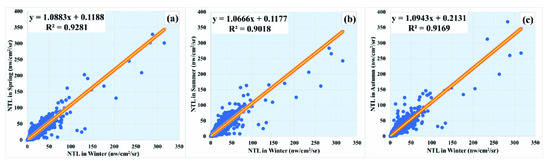 Linear relationship of filtered NTL intensity between winter and the other three seasons at the pixel scale: (a) spring–winter; (b) summer–winter; (c) autumn–winter.