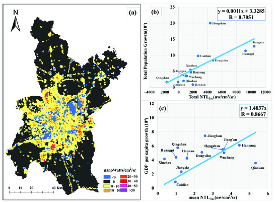 Dynamics NTL illumination in Wuhan during 2013–2018: (a) the increase of NTL radiance intensity during 2013–2018; (b) linear regression analysis between total population growth and total at the district scale; (c) linear regression analysis between GDP growth per capita and mean at the district scale.