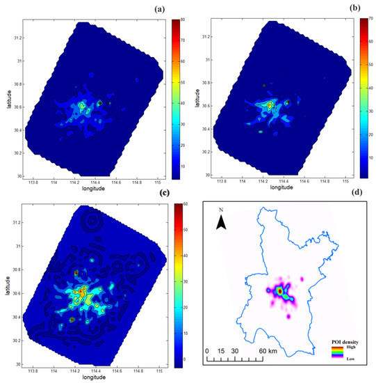 Urban area hotspots in Wuhan during 2013–2018 identified by SVM regression method: (a) urban area hotspots in 2013; (b) urban area hotspots in 2015; (c) urban area hotspots in 2018; (d) spatial distribution of POI density in 2018.
