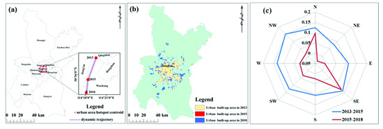 Consistency between the movement of urban area hotspots and urban expansion variation: (a) the movement of gravity center in Wuhan; (b) urban built-up area dynamics during 2013–2018; (c) expanding intensity of Wuhan from 2013 to 2018.