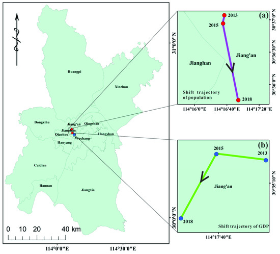 The shift trajectory of population and GDP gravity center of Wuhan during 2013–2018: (a) the shift trajectory of the population gravity center; (b) the shift trajectory of GDP gravity center.