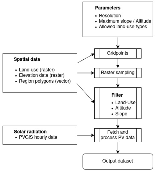A framework to automatically read land-use and relief data, filter by land use codes, altitude, and slope and further download solar PV data was developed and can be found online: https://github.com/inwe-boku/pvaustria2021 (accessed on 10 June 2021). The framework is able to fetch Solar Data automatically from a defined source, and join, manipulate and alter it using various spatial methods.