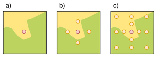 Raster sampling methods: the outline shows the vector grid outline, red is the grid center, in yellow additional sampling points depending on the chosen method are shown, (a) shows the sampling of one value within a gridpoint, (b) of 5 values and (c) of 13 values.