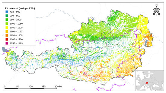 Rooftop PV cadastres exist for six federal states in Austria: Burgenland (http://www.eubgld.at/index.php?id=1893, accessed on 15 November 2020), Carinthia (https://gis.ktn.gv.at/webgisviewer/atlas-mobile/map/Energie, accessed on 15 November 2020), Salzburg (https://www.salzburg.gv.at/sagismobile/sagisonline, accessed on 15 November 2020), Styria (https://gis.stmk.gv.at/atlas, accessed on 15 November 2020), Tyrol (https://www.tirolsolar.at, accessed on 15 November 2020) and Vienna (https://www.wien.gv.at/stadtentwicklung/stadtvermessung/geodaten/solar/index.html, accessed on 15 November 2020), and additionally for the cities of Linz (https://webgis.linz.at/rpweb/Solarpotential.aspx, accessed on 15 on November 2020), St. Pölten (http://st-poelten.map2web.eu/, accessed on 15 November 2020), Baden (http://gis.stadtgemeinde-baden.at/, accessed on 15 November 2020) and Feldkirch (https://swap.feldkirch.net/s/z6tAKyB7FbYUkra, accessed on 15 November 2020). Nevertheless, the data provided is usually not downloadable, but can only be viewed online.
