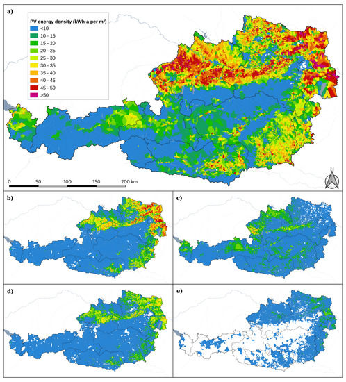 Austrian ground mounted PV energy density in −2 for the whole cadastral municipality, spatial scenarios: (a) All Open, (b) Crops & Vegetables, (c) Pastures, (d) Cereals, (e) Vegetables.
