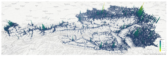 For the assessment of building footprints and the available rooftop area, we processed official cadastral vector data extracted from https://basemap.at (accessed on 20 June 2020) for rooftop PV. The data can be considered as complete and a total of million vector tiles with a total area of 784 km2 have been processed.