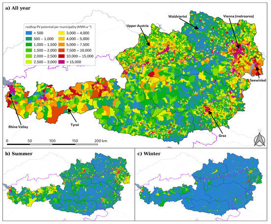 Figure 7 presents the rooftop PV potential for each municipality in −1, calculated with (a) all year values, with (b) values from summer months (June, July, August) and (c) values from the winter months (November, December, January). As already presented in Figure 4 high density urban areas show a high potential in rooftop solar PV, while less populated areas show lower values. Some areas have been highlighted as they showcase regional differences of Austria: (i) Rhine valley: densely populated, low rise, separated buildings, (ii) Tyrol: large municipalities (iii) Upper Austria: dense population throughout the federal state (iv) Waldviertel: low population density, small municipalities (v) Vienna: largest metro area in Austria, densely populated (vi) Seewinkel: large municipalities, dense villages (vii) Graz: second-largest metro area in Austria.