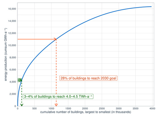 Figure 8 shows the cumulative PV potential by cumulative number of buildings sorted by footprint area (large to small). It can be seen that the 11 / goal can be reached by utilizing the rooftop potential of only 28% of buildings (all buildings larger than 210 2, if only taking into account the largest, while reaching feasible 4 / [6] to / (shown in Section 3.3 within the next 10 years would only need 3% to 4% of buildings (all buildings with a footprint larger than 880 2). Even though the number of buildings increases with decreasing footprint sizes, the potential from these buildings flattens the curve.