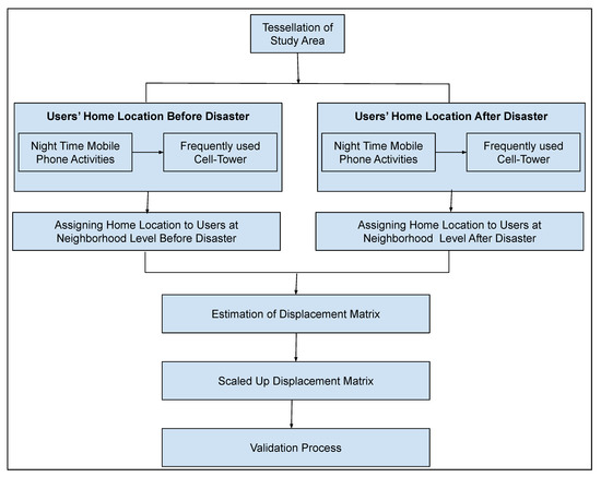 Estimation of the displaced population using anonymized mobile CDRs consists of multiple steps, and some of them were performed using proven techniques from previous research [25,38]. The proposed method involves six main steps, namely (1) Voronoi tesselation of the study area, (2) estimation of mobile phone users home location (at cell-tower level) before and after disaster, (3) neighborhood home location assignment before and after disaster, (4) estimation of displaced mobile phone users, (5) scaling up the displaced mobile phone users to actual population flow, and (6) validation process. The data processing was mainly carried out using Python API of Spark processing Framework (PySpark) as suggested by Cumbane and Gidófalvi [39].