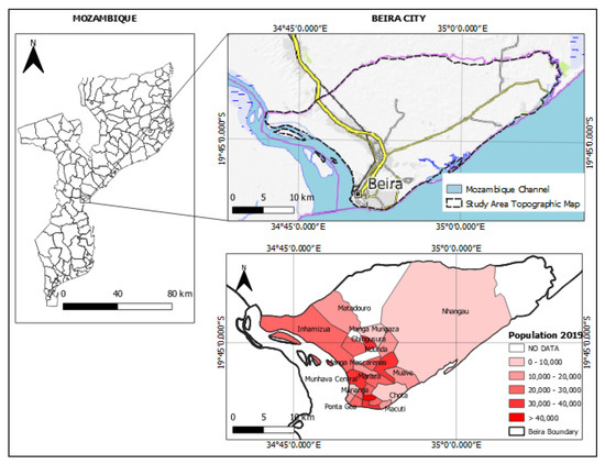 - REACH. Mozambique—Beira City—Population 2017 by Neighborhood (20 March 2019). 2019. Available online: https://reliefweb.int/map/mozambique/mozambique-beira-city-population-2017-neighborhood-20-march-2019\-enpt (accessed on 17 May 2020).