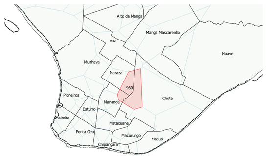In Figure 11, the absence can be noted of three neighborhoods that were present in the mobile phone users displacement matrix (Figure 10), namely Chamba, Nhaconjo, and Tchonja. The reason for this is the unavailability of population data for these neighborhoods in the map where these data were extracted, available in [31].