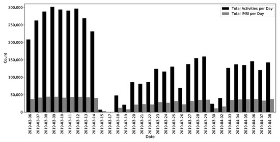 Total number of activities and IMSI per day in the study area.