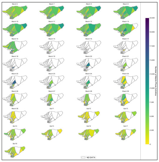 Figure 7 clearly shows that 14 March 2019 (the day that cyclone Idai landfall near Beira city) was the last day that the base transceiver stations registered the regular activities of mobile phone users. From 15 to 30 March 2019, some cell-towers did not register any mobile phone activity, represented by white color in each map and treated as NO DATA. This suggests that either the base stations were out of order (probably due to electricity failure or destruction) or all mobile phone users moved from the area covered by antennas to others. The choice of the cell-towers’ operational problem was observed on 15 and 17 March 2019 when only two cell-towers were operational (registered some users’ mobile phone activities). Nevertheless, it is possible to see the gradual recovery of the cell-towers after the disaster and the overload in some cell-towers whose neighbors were out of order. From 2 April 2019, over 78% of base stations were operational, but until 8 April 2019 (the last day of available data), there were still some cell-towers out of order. Even though Figure 6 suggests that from 18 to 29 March 2019 there is a gradual increase in the number of activities and subscribers registered by the mobile phone operator, Figure 7 shows that many of the cell-towers during this period were out of order. Therefore, to reduce biases due to false displacement, in this study, the periods before and after the disaster were considered to be 6 to 14 March 2019 and 2 to 8 April 2019, respectively.