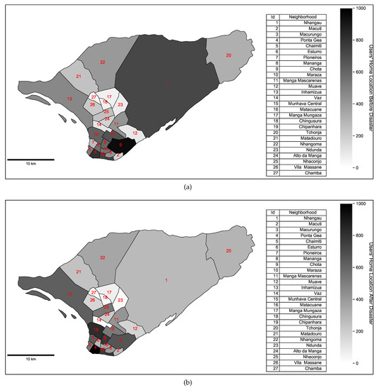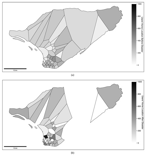 (a) Aggregated mobile phone users before the disaster and (b) aggregated mobile phone users after the disaster.