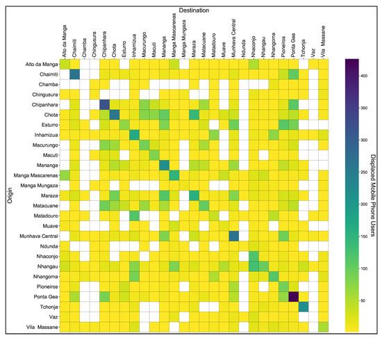 In Figure 10, the diagonal northwest (NW)–southeast (SE) elements of the matrix represent the mobile phone users who were not displaced after disaster, i.e., the users who remained in their home neighborhood. The other elements in the matrix represent the mobile phone users’ flow from origin to destination. Some neighborhoods registered a high number of mobile phone users who remained in their origin areas, namely Chaimite, Chipanhara, Chota, Mananga, Munhava central, Ponta-Gea, and Tchonja. Among this neighborhoods, the highest number of non-displaced mobile phone users was registered in Ponta-Gea, which is justified by only 29% of damaged infrastructures in this area (the lowest damaged rate in entire Beira city) REACH [42]. Moreover, it is possible to see that few mobile phone users moved to Ndunda and Vaz neighborhoods. This is because these two neighborhoods were among the most damaged ones (both with damaged buildings over 80%) REACH [42].