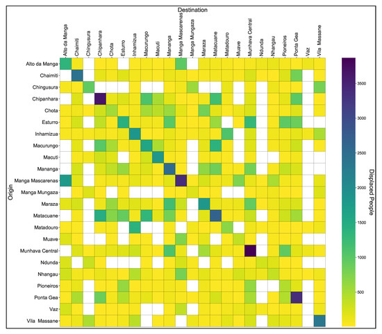 The derived displacement matrix shows that a considerable number of people left their origin neighborhoods after the cyclone. This is supported by the damage infrastructure data; i.e., in the most affected areas, there is a high outflow and low inflow, and in the less affected area, there is high inflow and low outflow. However, in some cases, even though the area was highly affected (e.g., Mananga and Matadouro), the inflow was higher than the outflow. This is probably due to the availability of shelters; i.e., even though the area was highly affected, there were enough shelters for the affected people coming from different areas. The opposite behavior was observed in Esturro neighborhood, where, even though the area was less affected, the inflow was relatively less than the outflow. This situation can be explained by the flood extent in this area; i.e., even with fewer damages, the water level in the area might have forced people to leave their houses to other less affected areas.