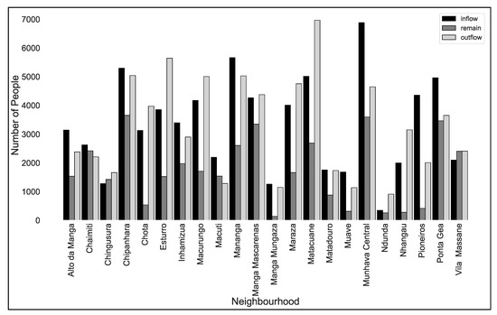 From Figure 12, it is clear that overall the number of people who remained in each neighborhood was less than the inflow (number of arrival in the neighborhood) and outflow (number of people who left the neighbor after the disaster). However, inflow and outflow vary from one neighborhood to another; i.e., in some cases, the inflow is greater than outflow (e.g., Ponta Gea, Alto data Manga, etc.), and in other cases, the inflow is less than outflow (e.g., Vaz, Esturo, Matacuane, etc.). These differences are supported by the idea that some neighborhoods were more highly affected than others REACH [42], as shown in Figure 13.