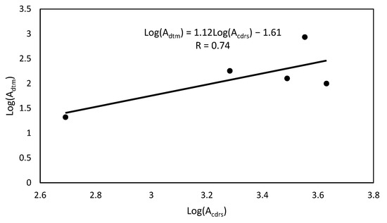 Moreover, based on Equation (6) and the values of logarithms of arrivals in each administrative neighborhood from CDRs () and the arrivals in each administrative neighborhood from DTM , a standard linear regression model was fitted and correlation coefficient between the two variables was determined as shown in Figure 14.