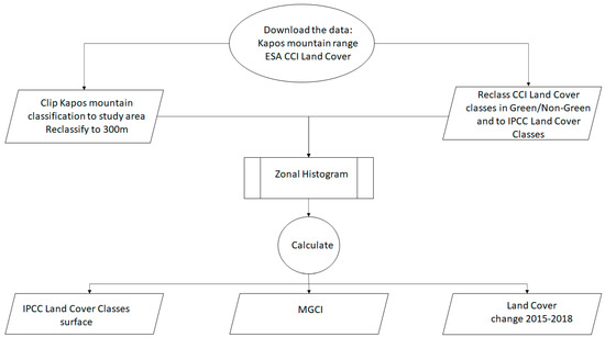 Specifically, the first step in calculating the overall MGCI value involved the resampling of the elevation range layer at a 500 m resolution to the 300 m resolution of the CCI-LC layer. Secondly, the land cover maps for the years 2000, 2010, 2015, and 2018 were reclassified by mapping the 37 land cover classes featured in the CCI-LC to the six corresponding IPCC land use/land cover classes, four of which are categorized as green (forestland, cropland, grassland, wetland) and two of which are considered non-green (other land, settlement). Results are shown in columns c and d in Table 2.