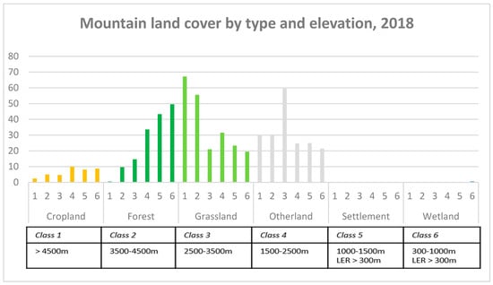 - Settlement and wetland: The share of mountain cover of settlements and wetland is negligible at all elevation ranges, although also with a tendency to decrease with higher altitudes.