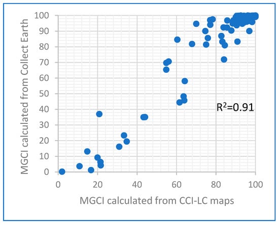 MGCI estimates were calculated at a national level from the ESA CCI-LC for the year 2017 and compared with MGCI estimates calculated by the FAO in 2017 using Collect Earth. The two datasets were analyzed using a t-test assuming equal variance as shown in Figure 5. Results showed that the difference between the means of the two distributions was not statistically significant (P = 0.51). The high consistency between the dataset was further confirmed by linear regression yielding an R2 = 0.91. This test confirms the consistent quality of the CCI-LC estimates and indicates that both methodologies are valid for assessing the status of the indicator. The benefit of using the wall-to-wall approach (ESA CCI-LC) becomes evident when comparing the changes (which systematic sampling could not detect well as they were rare), time required for the data collection, and validation, which is simpler.